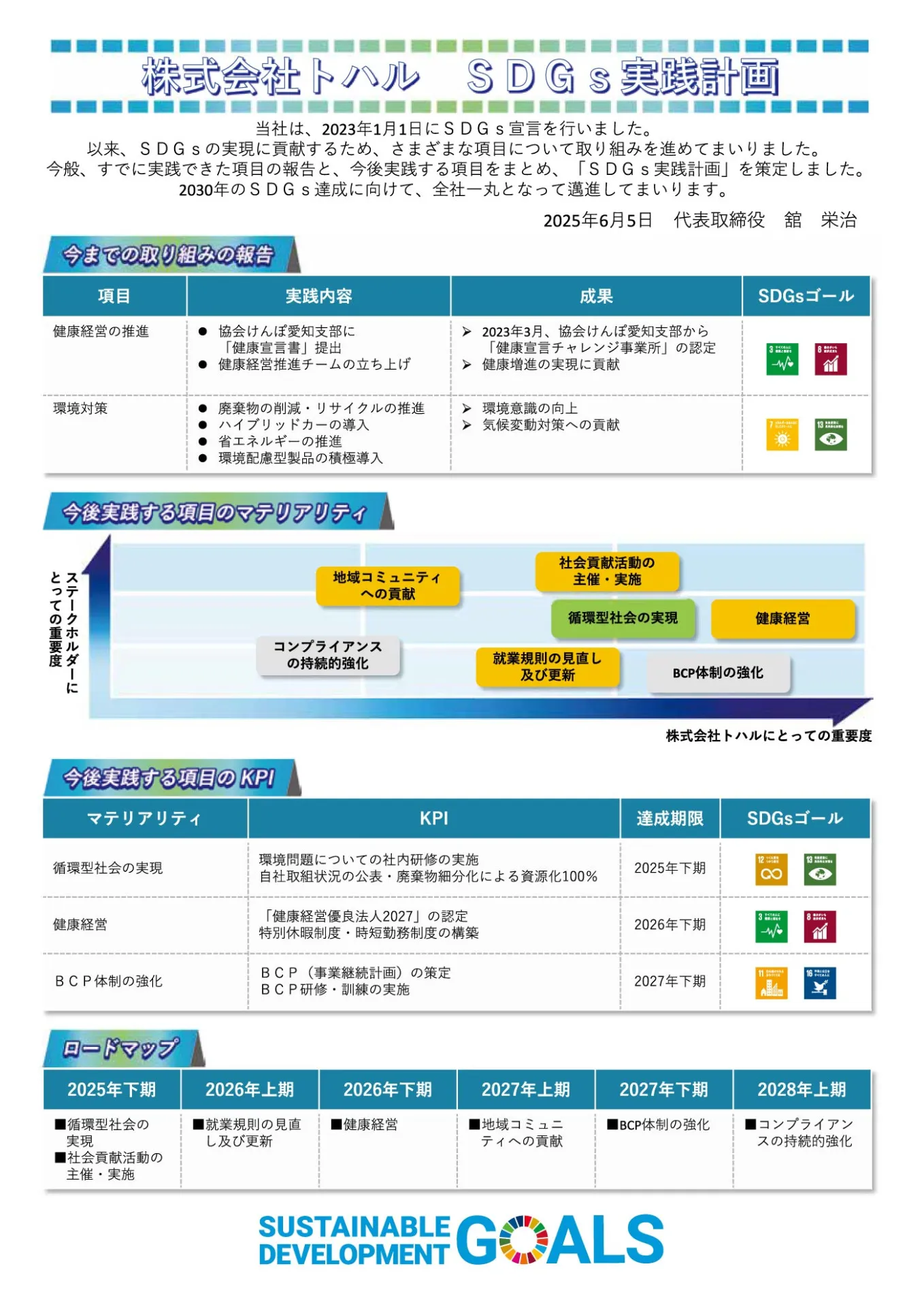 これまでの活動と成果を踏まえ、健康経営、環境対策、地域貢献など、持続可能な社会の実現に向けた取り組みを段階的に進めていきます。 2030年のSDGs達成を目指し、全社一体となって行動し、地域社会への貢献と持続可能な企業経営の実現に取り組んでまいります。